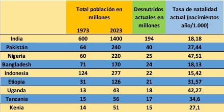 Y detrás de estos conceptos están las terribles cifras de la pobreza. De los 8.000 millones de personas, unos 900 millones son pobres y están desnutridas. Muchas de ellas de países muy poblados que aún tienen altas tasas de natalidad especialmente en sus colectivos más necesitados. Pongo cifras aproximadas de algunos países en desarrollo.